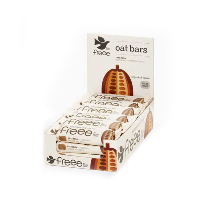 Βιολογική μπάρα βρώμης ολικής άλεσης με κομματάκια σοκολάτας, χωρίς γλουτένη. Παρασκευάζεται στην αρτοποιία Wiltshire της Doves Farm από άριστης ποιότητας και μη γενετικά τροποποιημένα συστατικά βιολογικής γεωργίας. Δημιουργούνται σε ελεγμένη και πιστοποιημένη γραμμή παραγωγής, και δεν περιέχουν γάλα, φιστίκια, αυγά ή σόγια. Ζυμώνονται με φοινικέλαιο βιολογικής γεωργίας από πιστοποιημένες φάρμες της Κολομβίας, χωρίς προσθήκη γαλακτοκομικών. Κατάλληλες και για χορτοφάγους ή vegans.