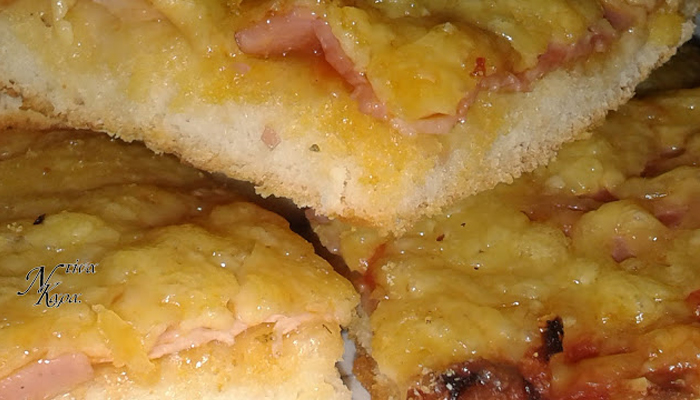 Όταν το ζυμάρι μας έχει φουσκώσει το βάζουμε πάνω σε μια λαδόκολλα στον πάγκο της κουζίνας και με τον πλάστη το ανοίγουμε σε ένα μεγάλο χοντρό φύλλο να χωράει στο ταψί της κουζίνας μας. Διαφορετικά μπορούμε να χωρίσουμε τη ζύμη μας στα δύο και να φτιάξουμε δύο μικρότερα ταψιά πίτσα… Έχουμε προθερμάνει το φούρνο στους 250 βαθμούς . Με λίγη ποσότητα λάδι στα δάκτυλά μας έχουμε αλείψει το ταψί , έχουμε πασπαλίσει με καλαμποκάλευρο γιατί αυτό θα κάνει καλύτερη κρούστα στην πίτσα κι έχουμε βάλει το ταψί μέσα στην κουζίνα άδειο να κάψει ! Με προσοχή παίρνουμε το ταψί , το βάζουμε πάνω στον πάγκο σε ειδική επιφάνεια, βάζουμε μέσα το ανοιγμένο σε φύλλο ζυμάρι μας και το στρώνουμε καλά, προσέχοντας μην καούμε . Βάζουμε τη σάλτσα που έχουμε ετοιμάσει και τα υλικά όλα. Τοποθετούμε στην τελευταία κάτω θέση της κουζίνας και ψήνουμε στους 200 βαθμούς στις αντιστάσεις για 30 λεπτά. Φροντίστε να έχετε μπύρα παγωμένη ή ένα καλό κόκκινο κρασί αν προτιμάτε, μιας και το κρασί θα διώξει τη λιπαρότητα του τυριού απ’ το στόμα!
